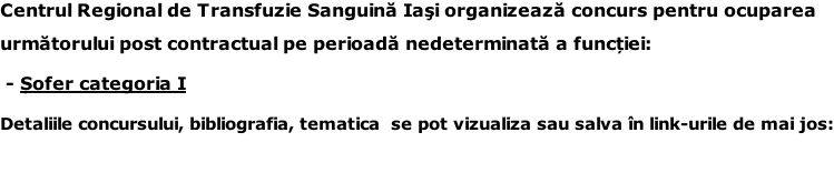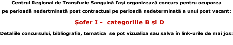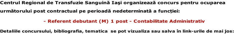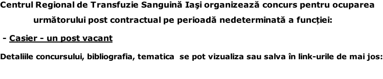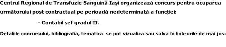 Centrul de Transfuzie Sanguină Iași anunță suspendarea concursului pentru ocuparea postului de contabil sef grad II.