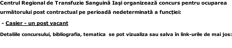 Centrul de Transfuzie Sanguină Iasi anunță anularea concursului pentru ocuparea postului de contabil șef grad II.